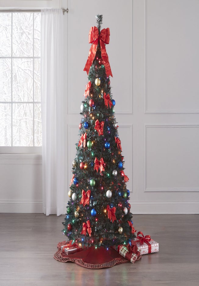 Named one of the best artificial Christmas trees to buy now for the 2024 holiday season by the NEW YORK POST! There’s a shortage of live trees but no shortage of convenience or value in our pop-up Christmas trees. The Post ranked ours Easiest Setup + Takedown. This Fully Decorated Pre-Lit 6’ Pop-Up Christmas Tree is perfect for living rooms, entryways, bedrooms, or any space that needs festive sparkle. This lush beauty arrives as a pancake-flat sphere. Simply assemble the stand and voila! It cascades down into a gorgeous display pre-decorated and pre-lit with ribbons, bows and ornaments. Our pop-up Christmas trees save you energy and won't cost a pretty. You won't have to get tangled up in tree lights or spend hours hanging ornaments.