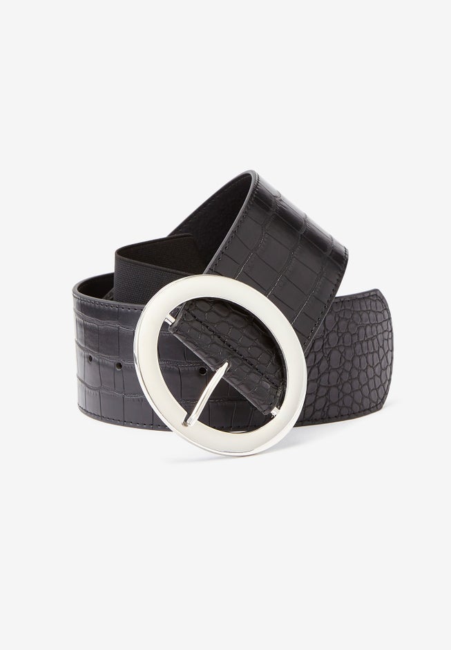 Finish off your outfit with a classic belt style–this one is designed with an elasticated back panel for the most comfortable, adjustable fit.Adjustable back snap closure. L fits sizes 20-22, XL fits sizes 24-26.