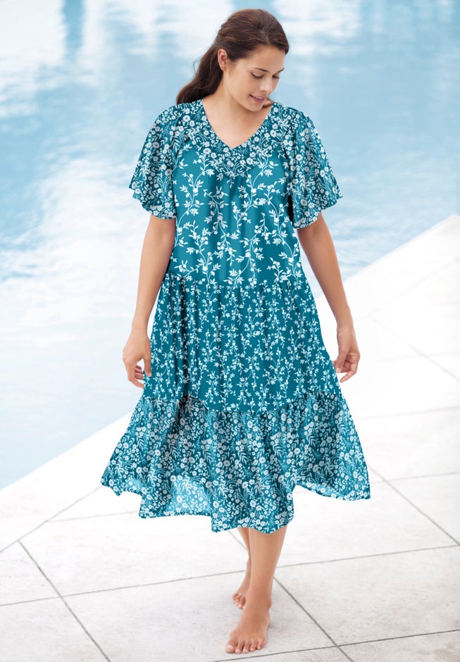 • Relax in style with our beautiful, feminine Tiered Print Lounger featuring a tiered skirt and flutter sleeves.